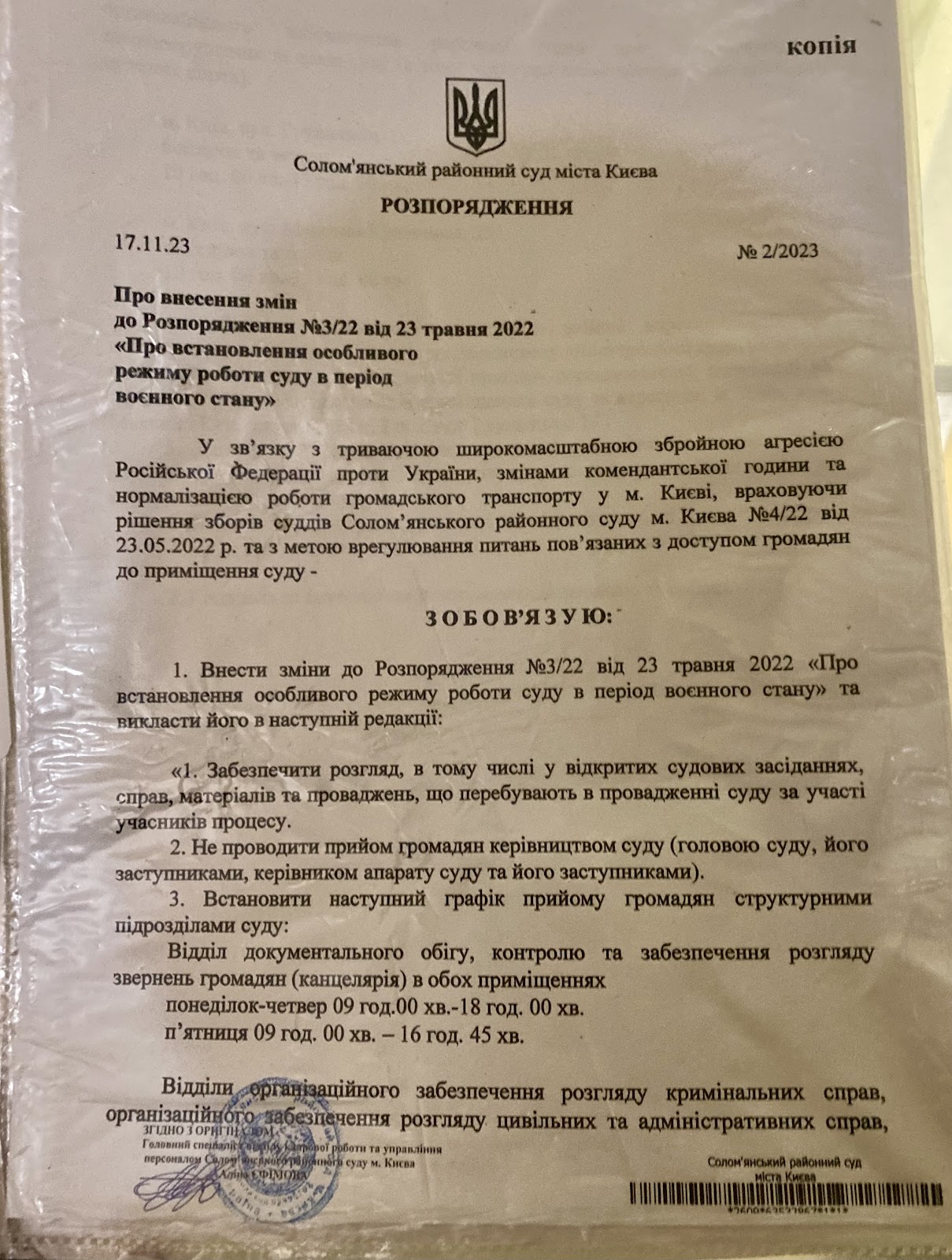 На сайті Соломʼянського суду також є новина, датована 3 червня 2022-го року про те, що розгляд справ в суді відбувається лише за участі учасників процесу.