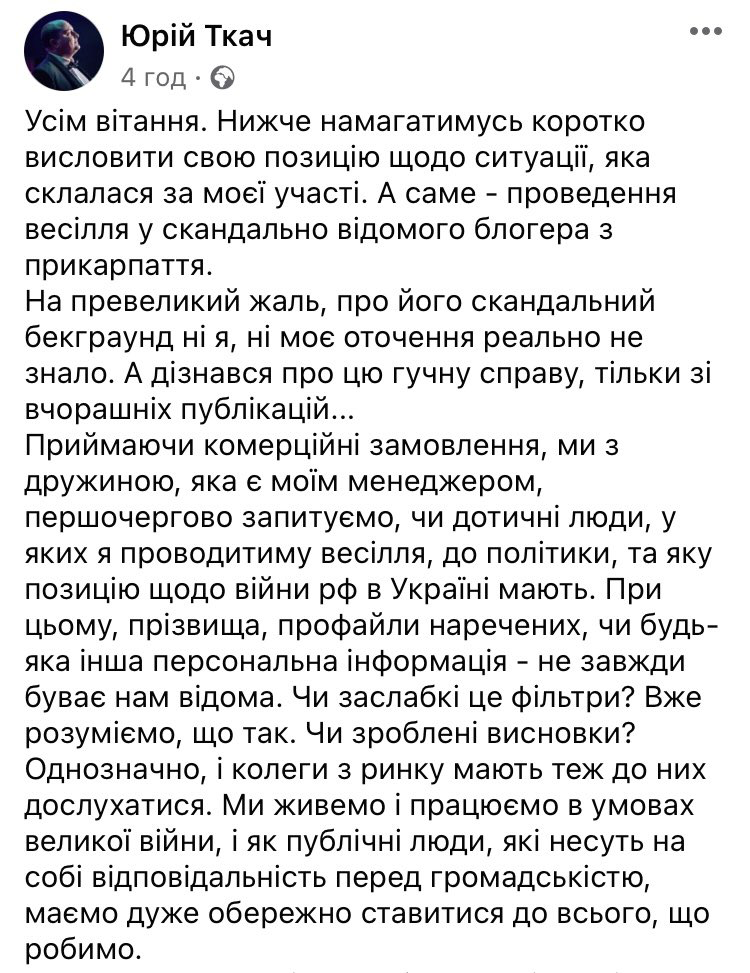 Після широкого розголосу Юрій Ткач вибачився у своїх соцмережах, заявивши, що не знав про особу Захара.