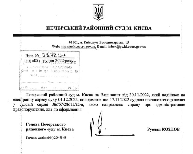 У постанові Печерського суду, яка з’явилась у відкритому доступі на початку грудня, йдеться: матеріали скеровано на доопрацювання через «неможливість визначити підсудність для розгляду вказаного протоколу». Адже у протоколі місцем вчинення інкримінованого Гарнику правопорушення вказана вулиця Велика Васильківська з номерами будинку 111/113 та 118.