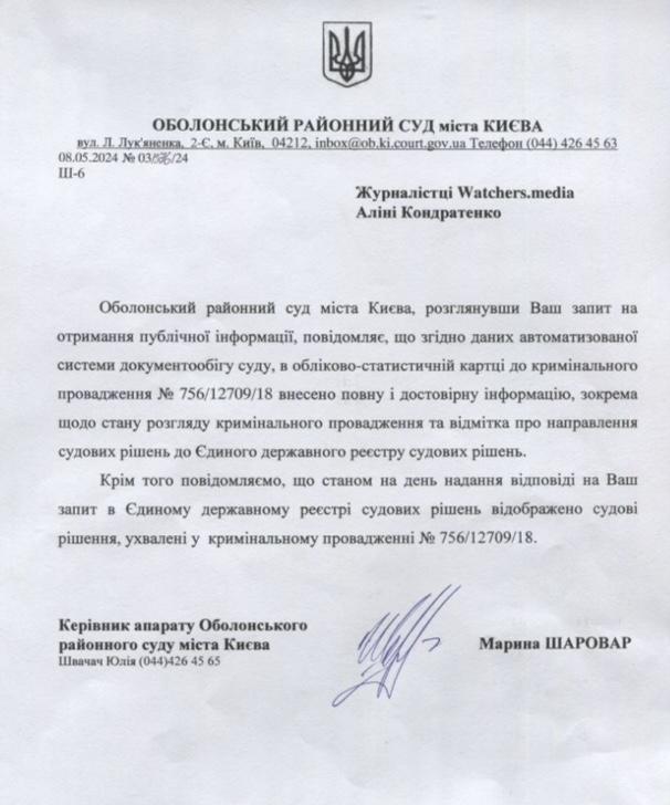 Після засідання 30 квітня 2024 року журналістка Watchers написала запит до Оболонського райсуду Києва, аби дізнатися, чому в єдиному реєстрі судових рішень немає жодної ухвали вказаного суду у цій справі, зокрема і щодо зміни запобіжного заходу. Після запиту тексти судових рішень зʼявилися у реєстрі.