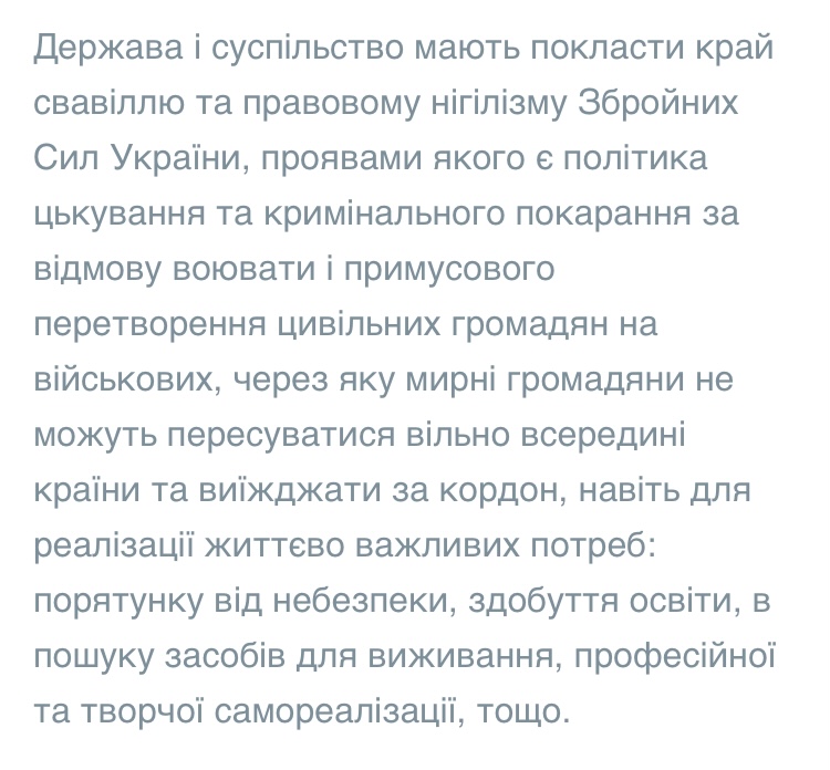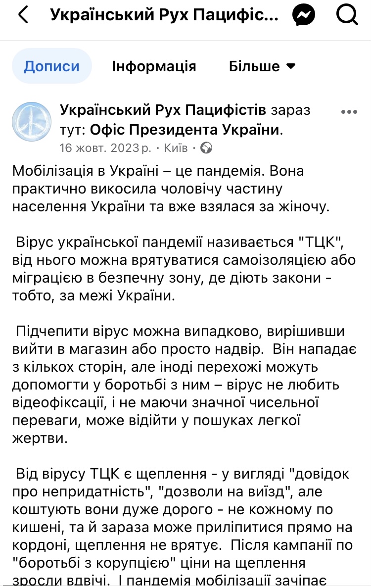 А у жовтні 2023-го на сторінці організації заявився допис, де автори стверджують, мовляв, «вірус української пандемії називається “ТЦК”, від нього можна врятуватися самоізоляцією або міграцією в безпечну зону, де діють закони – тобто, за межі України».
