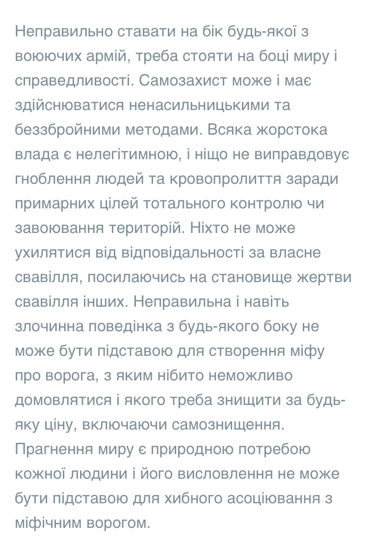 «Там не сказано саме про росію. Міфічний ворог – там йдеться про те, що не треба собі створювати міфічного ворога. Там не йдеться конкретно до кого це застосовується. Це абзац про загальні принципи пацифістського світогляду», – додав він.