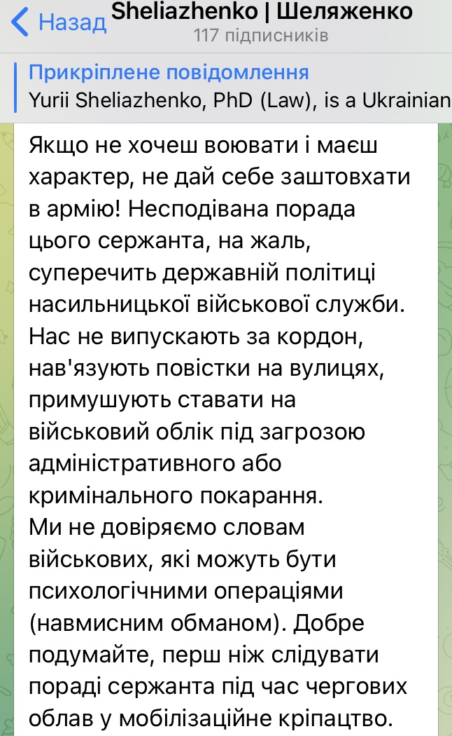 У своєму телеграм-каналі, у січні 2023-го, Юрій Шеляженко написав допис, де серед іншого використав образливе словосполучення: «мобілізаційне кріпацтво».