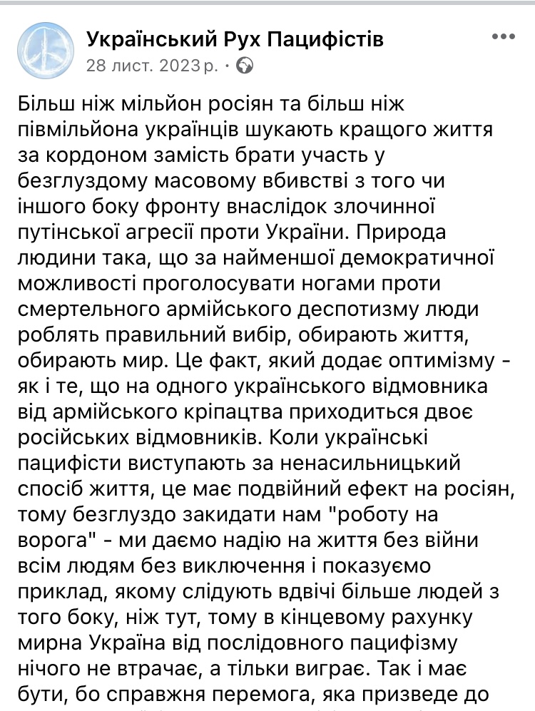 У 2023-му році на сторінці руху пацифістів зʼявився допис, де зокрема використовуються словосполучення «армійське кріпацтво» та «безглузде масове вбивство». Цей допис є супровідним текстом до статті, котру поширила організація про те, скільки чоловіків виїхало з України.