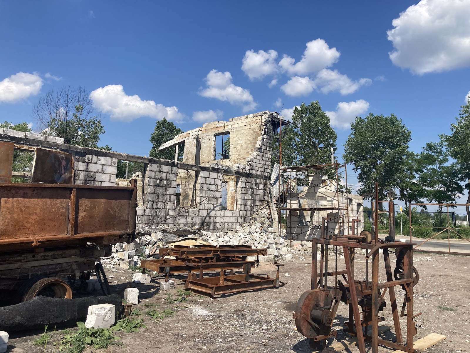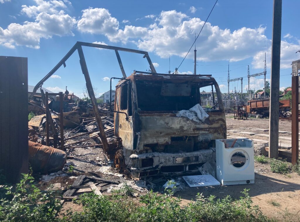 Дорогою до Горенки повертаємо з основної траси у напрямку селища і в око одразу впадає понівечена російськими ракетами пилорама. Довкола – суцільне згарище, замість колись працюючого підприємства – купа зруйнованого устаткування.