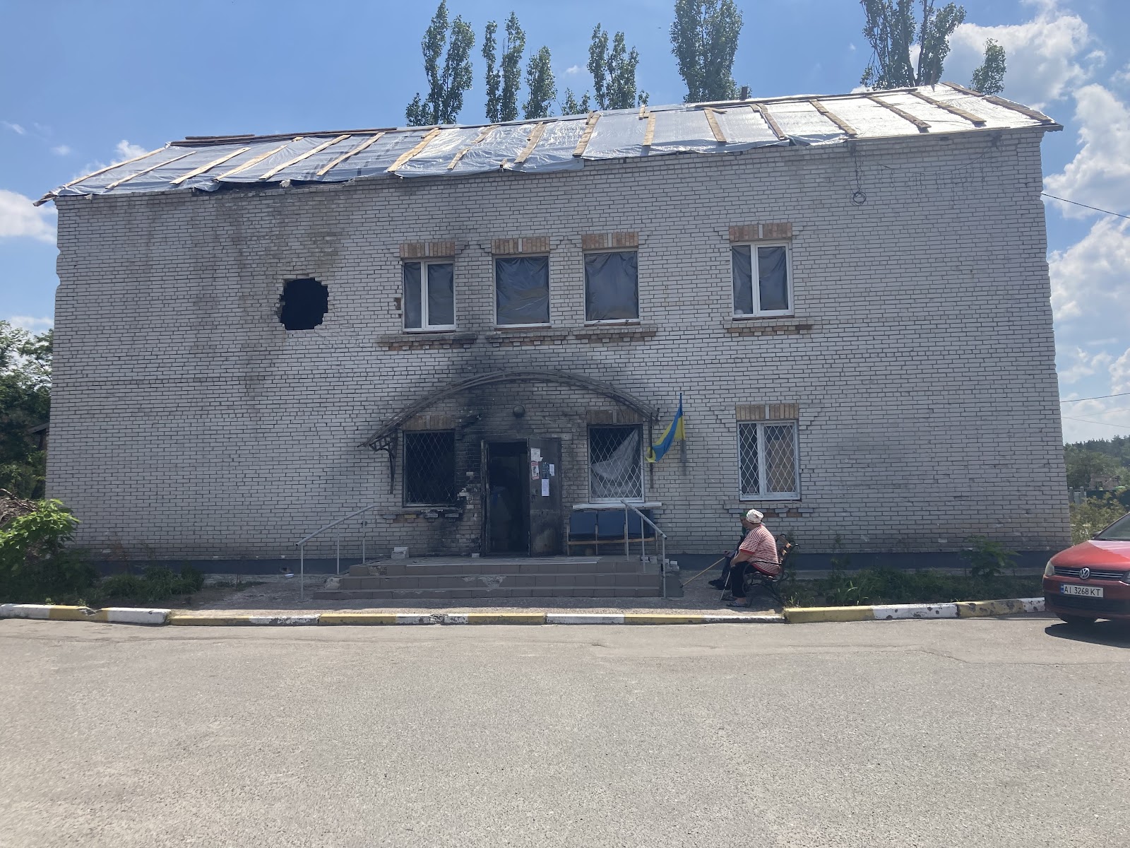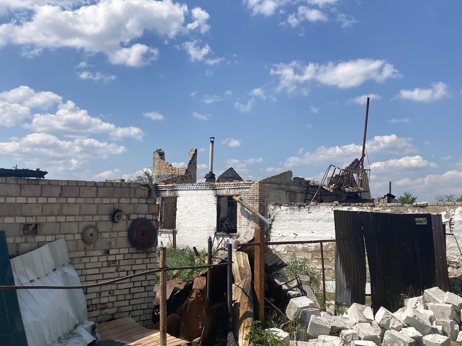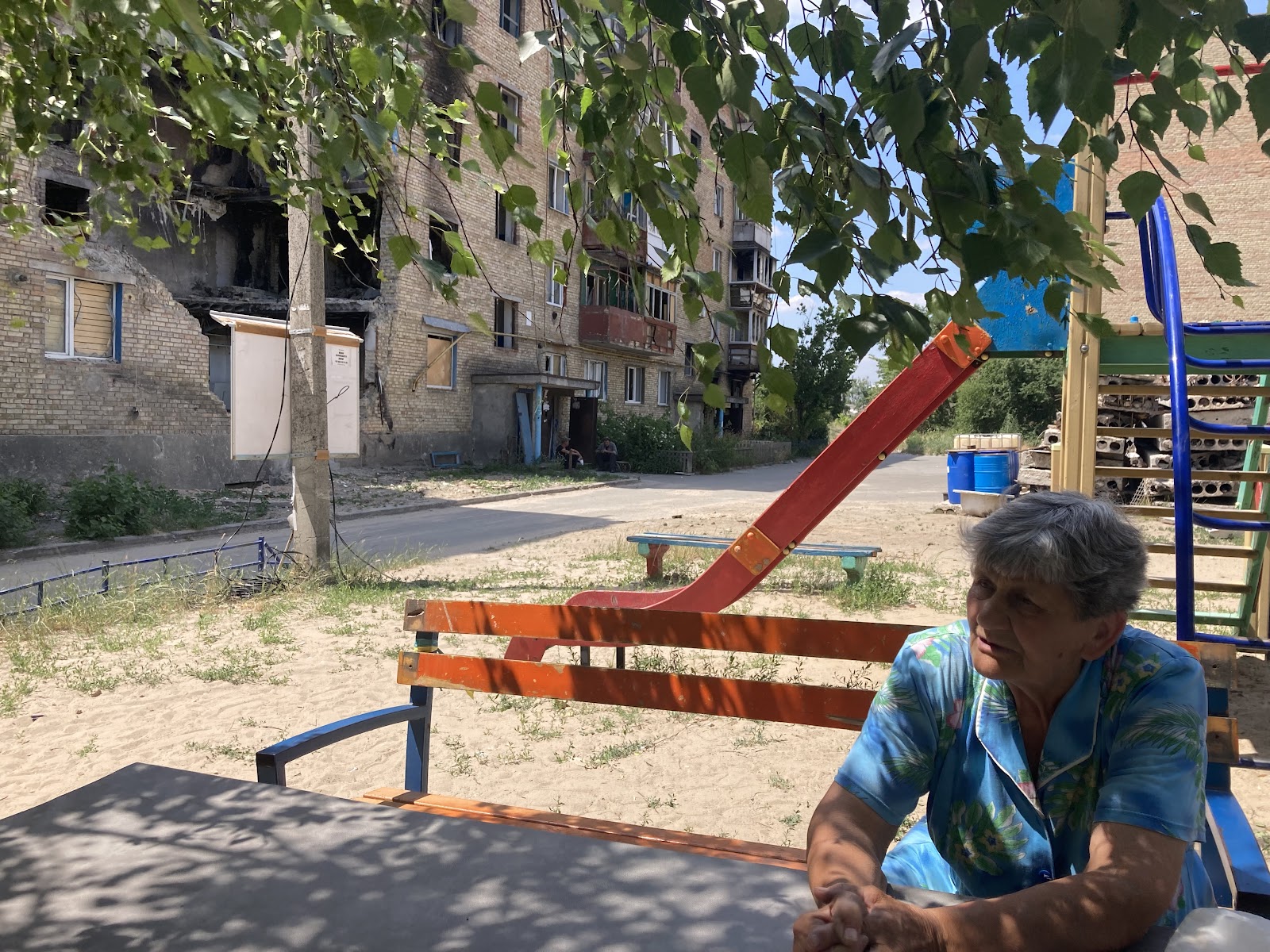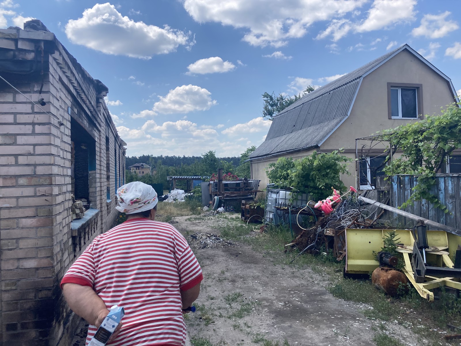 Біля клубу зустрічаємо Катерину Андріївну, жінку похилого віку, яка показує нам наслідки дій окупантів на прикладі свого будинку. На подвір’ї вона демонструє зруйнований пожежею гараж, а також погреб, де перебула початок повномасштабного вторгнення. На початку березня 2022-го року вона поїхала в евакуацію, але все ж повернулась додому.