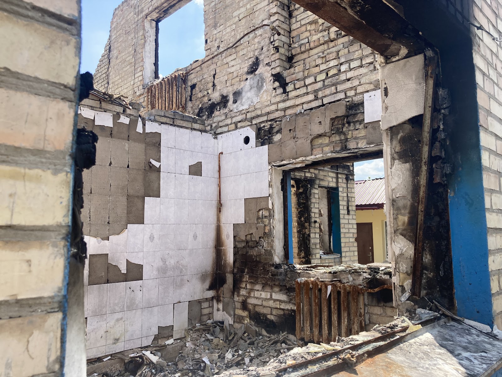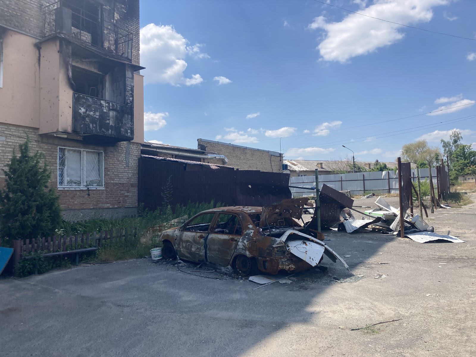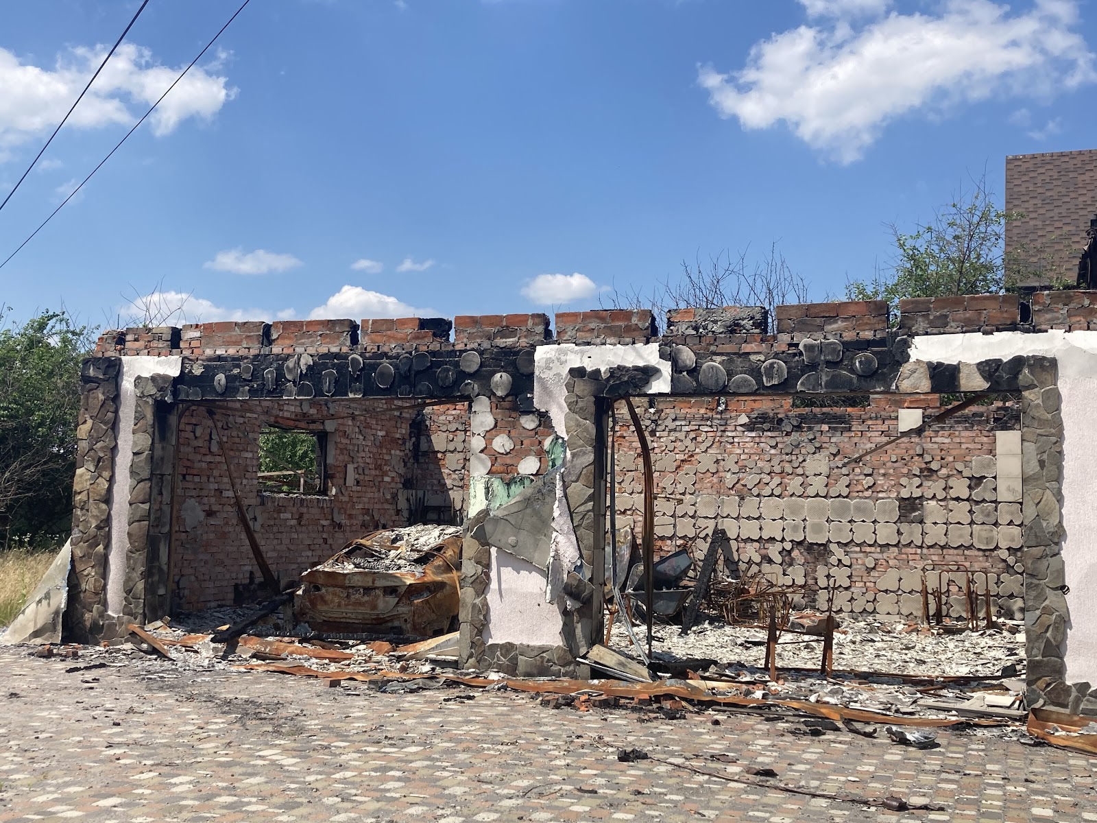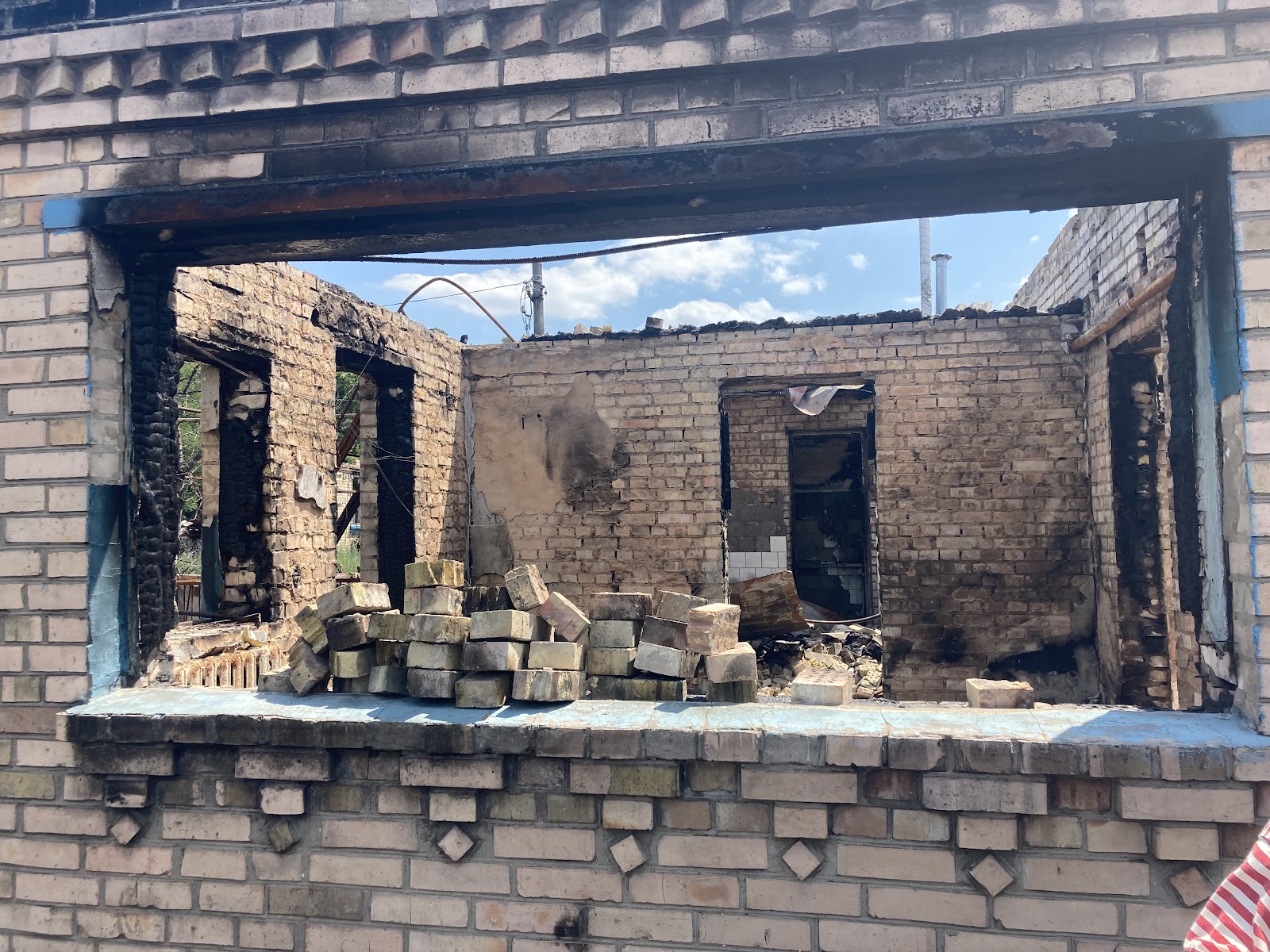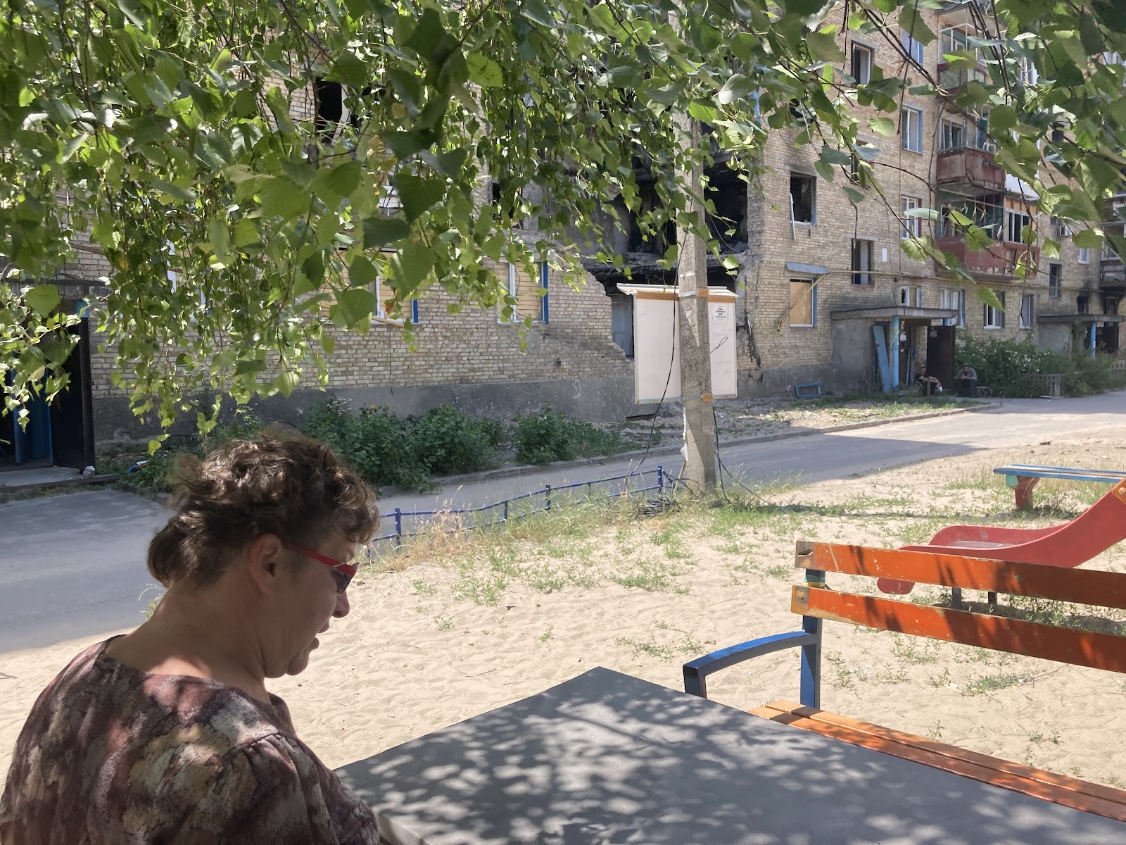Біля клубу зустрічаємо Катерину Андріївну, жінку похилого віку, яка показує нам наслідки дій окупантів на прикладі свого будинку. На подвір’ї вона демонструє зруйнований пожежею гараж, а також погреб, де перебула початок повномасштабного вторгнення. На початку березня 2022-го року вона поїхала в евакуацію, але все ж повернулась додому.