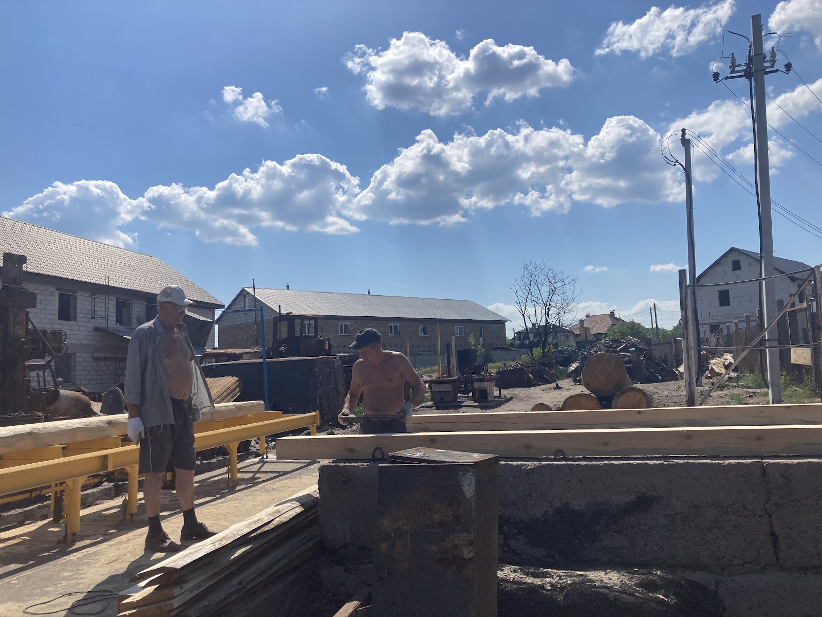 Проте на терасі бачимо двох чоловіків, які активно працюють. Вони кажуть, що треба повертатись до звичного ритму життя: відновлювати підприємство та заробляти гроші. Вони почуваються бадьоро та виглядають цілеспрямовано. Згодом розповідають: їх будинки в селі зазнали хоч і не критичних, але все ж пошкоджень.