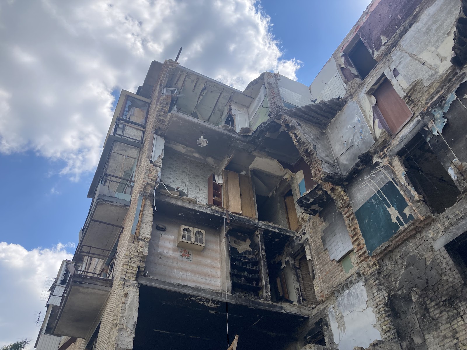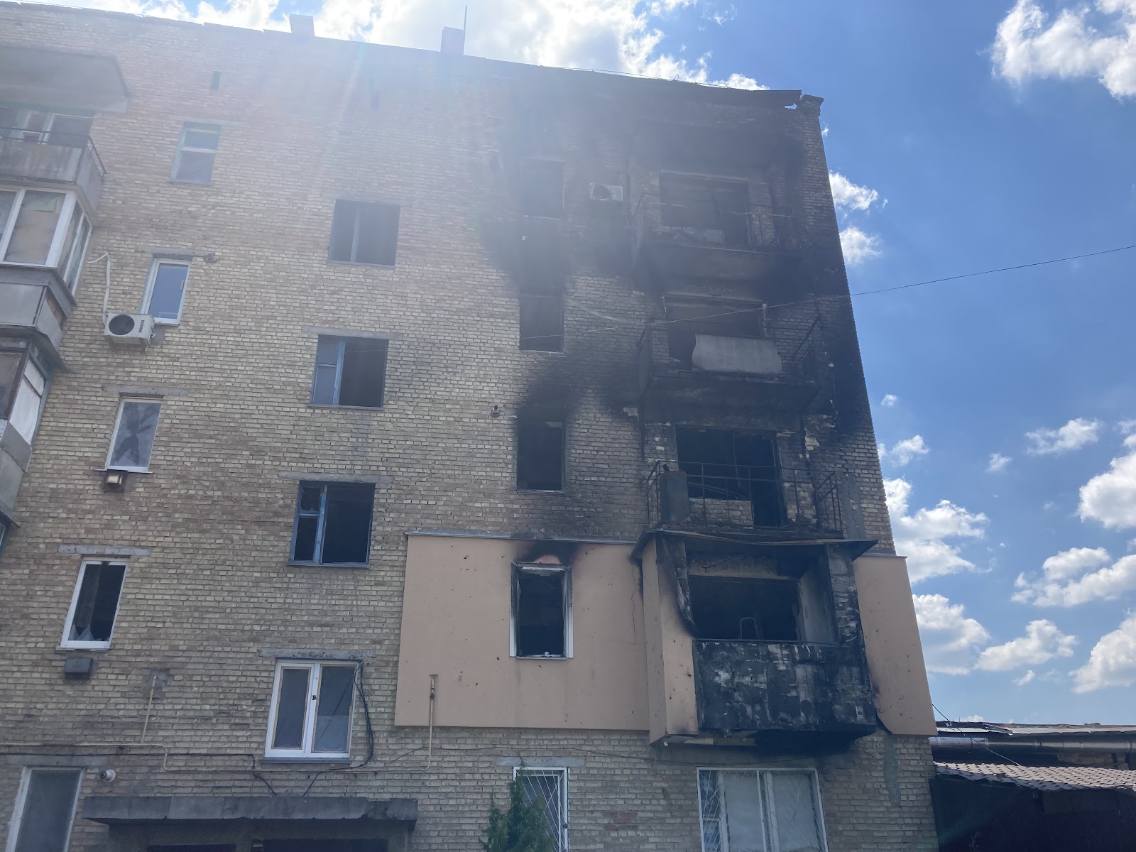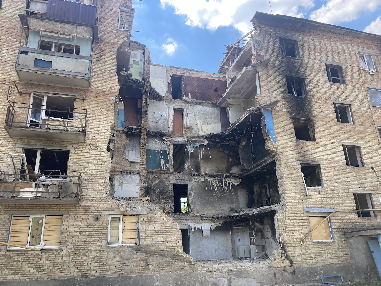 У селищі є і багатоквартирні будинки. Два з них – п’ятиповерхові, в одному – 60 квартир, у другому – 45. Перший будинок майже зруйнований. Тут у людей немає ані світла, ані газу, ані навіть води.