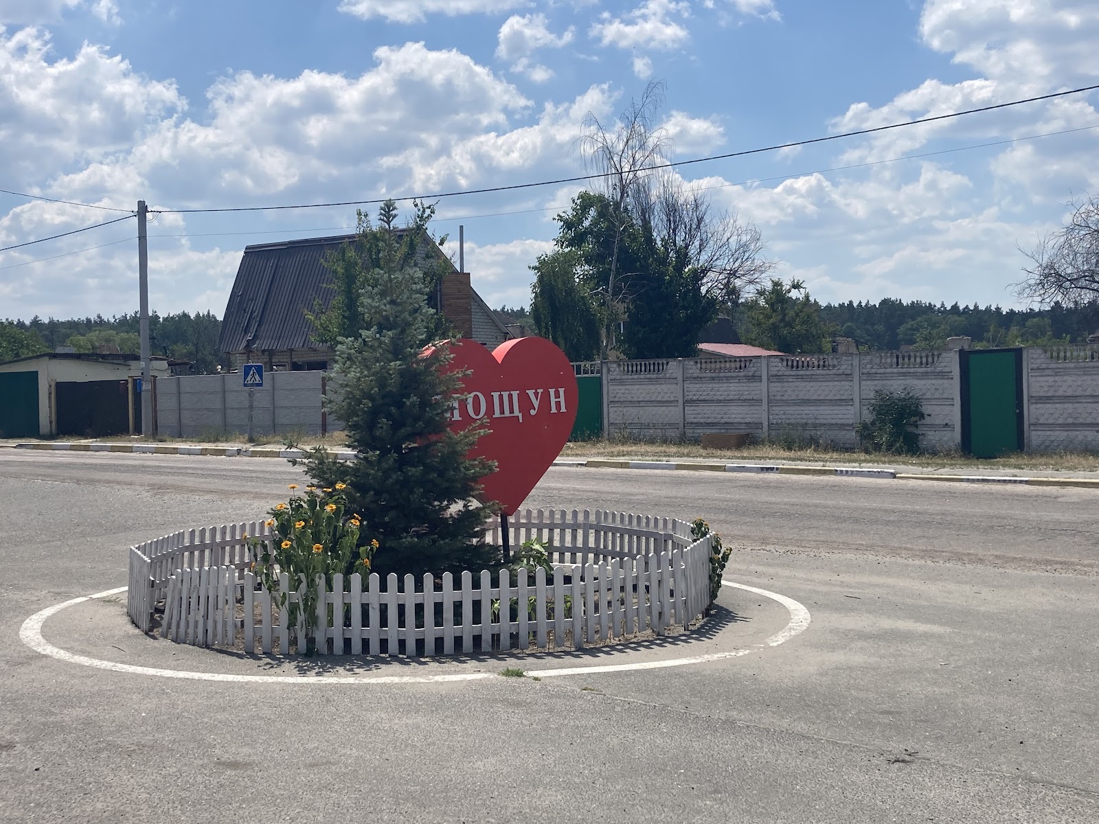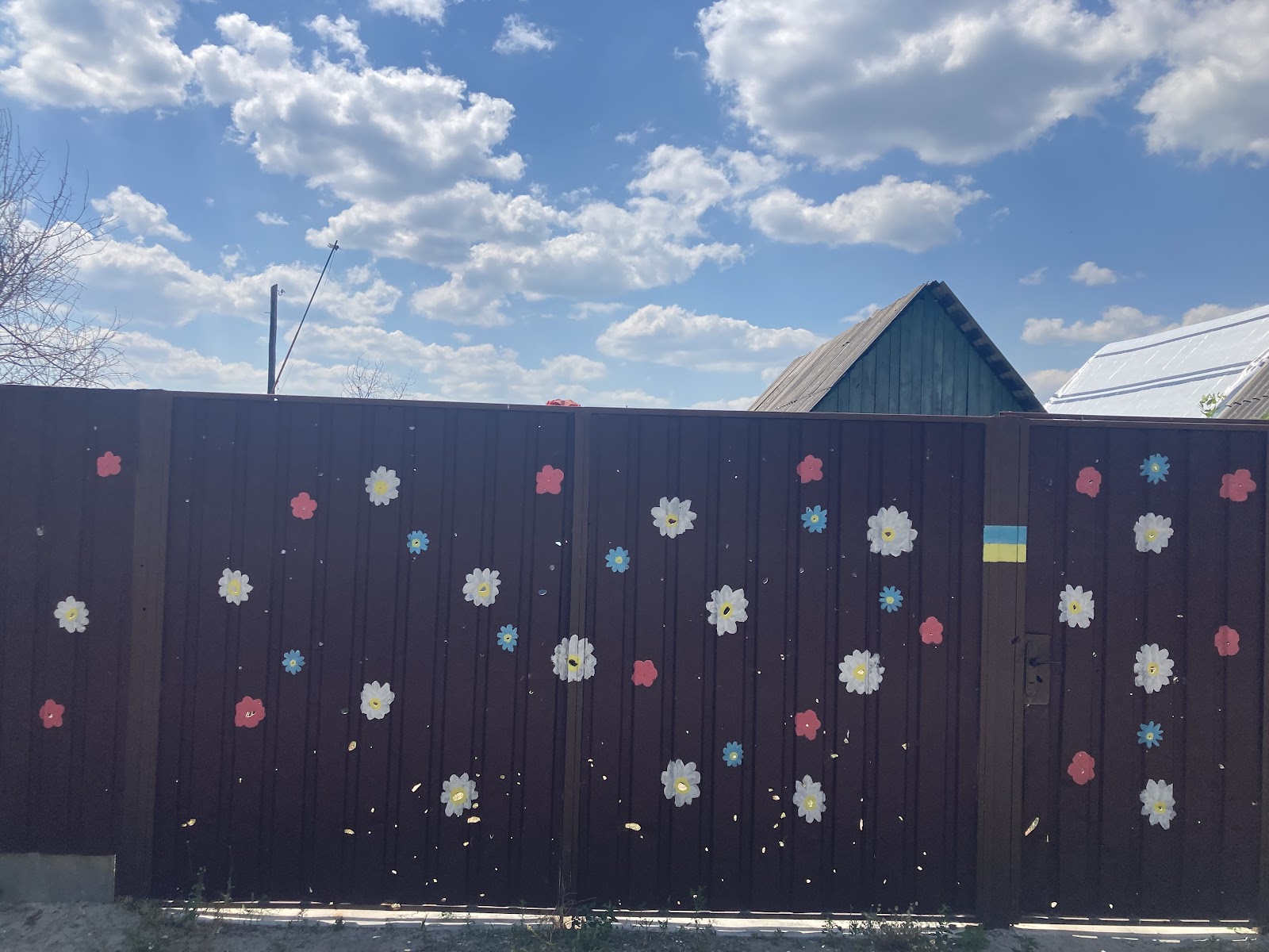 На одному з парканів різнокольоровими квітами власники замалювали сліди від куль та розривів російських снарядів.
