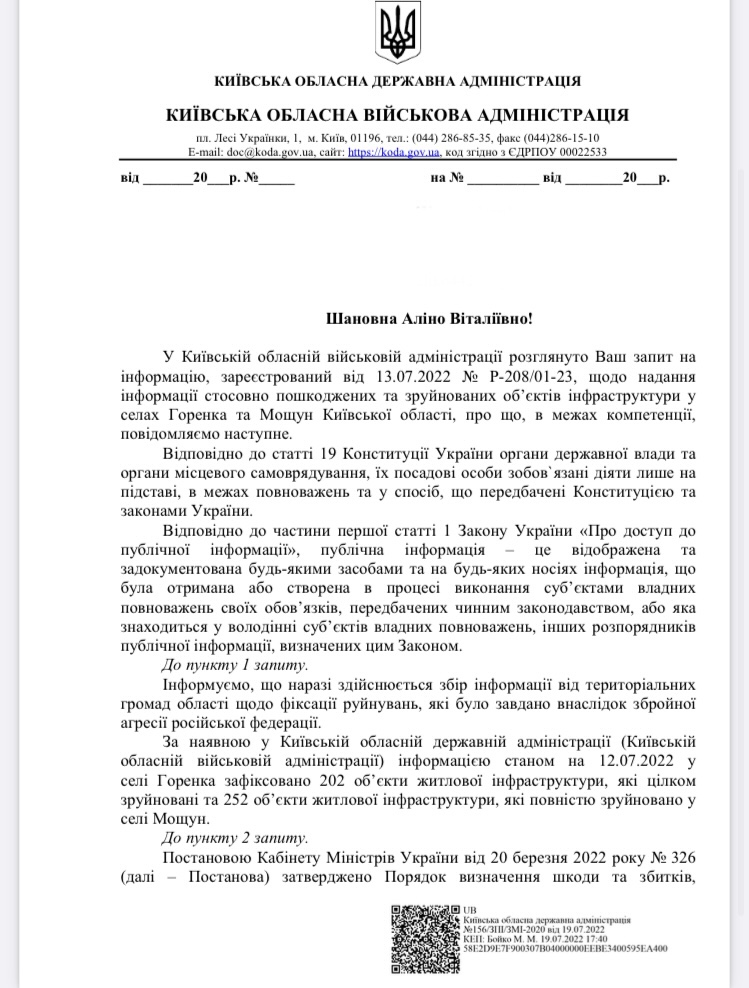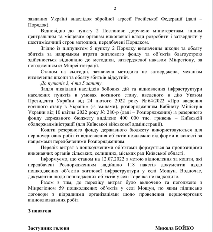 У Горенці повністю зруйнованими вважаються 202 об’єкти житлової інфраструктури. У Мощуні цілком зруйновані – 252 таких об’єкти. Про це йдеться у відповіді Київської обласної військової адміністрації (КОВА) на наш запит.