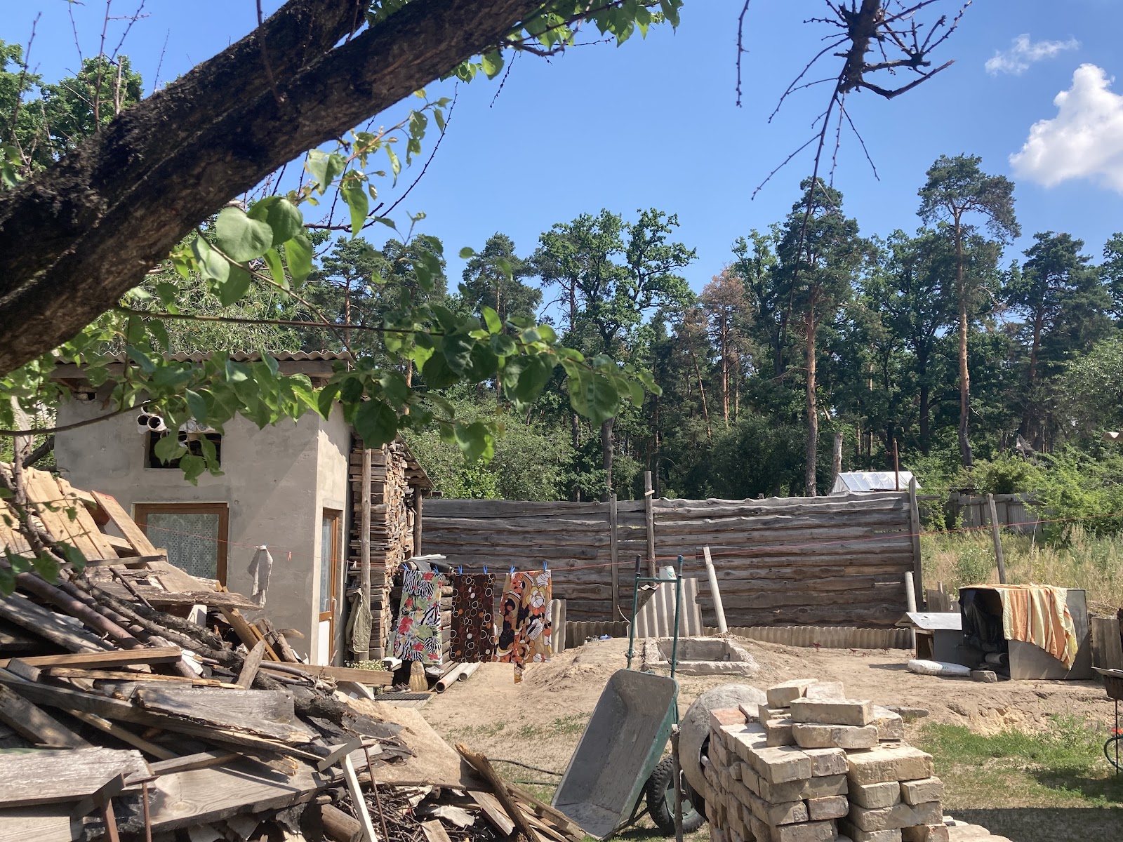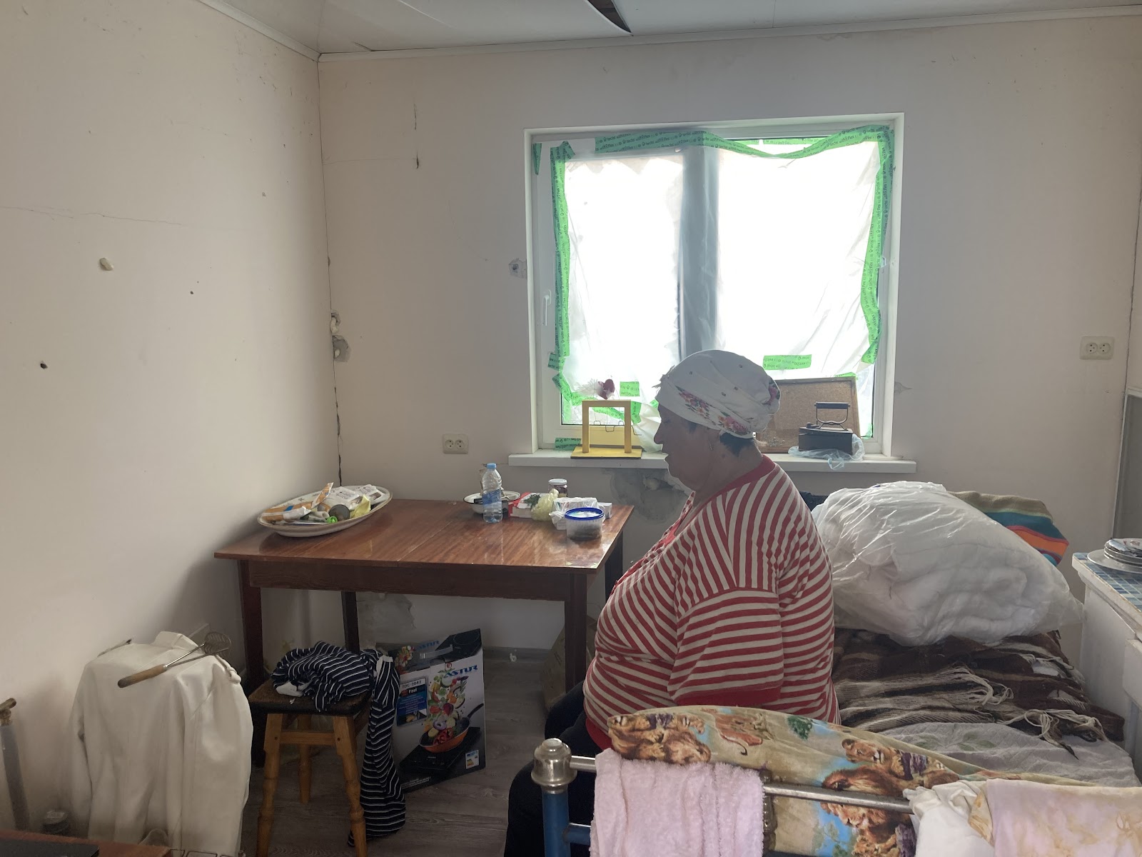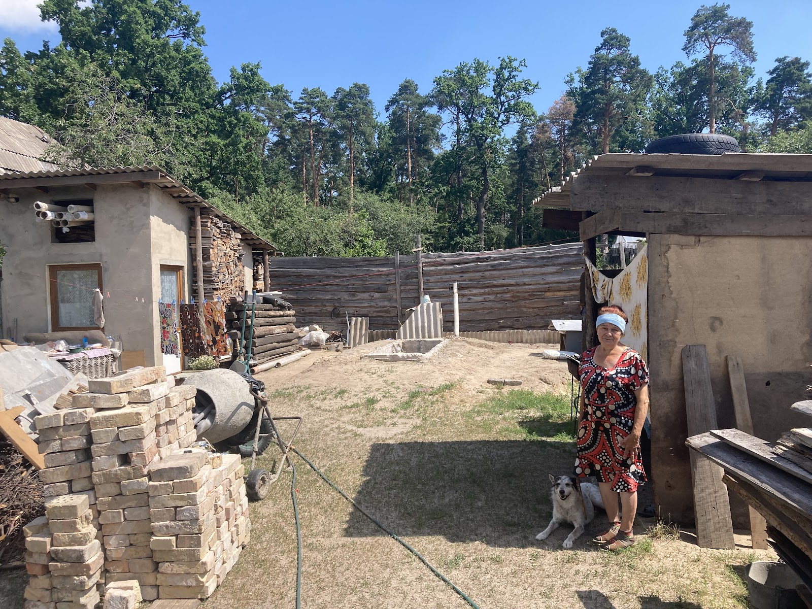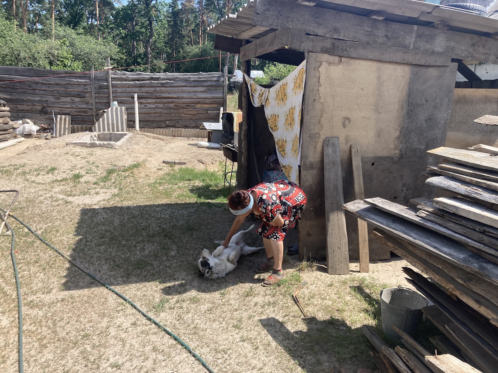 Жінка розповідає, що прихистила родича та сусіда, чий будинок згорів вщент. Йому облаштували на вулиці спальне місце, огороджене ковдрами та дошками. За словами Ніни, він щиро радий доброті власників.