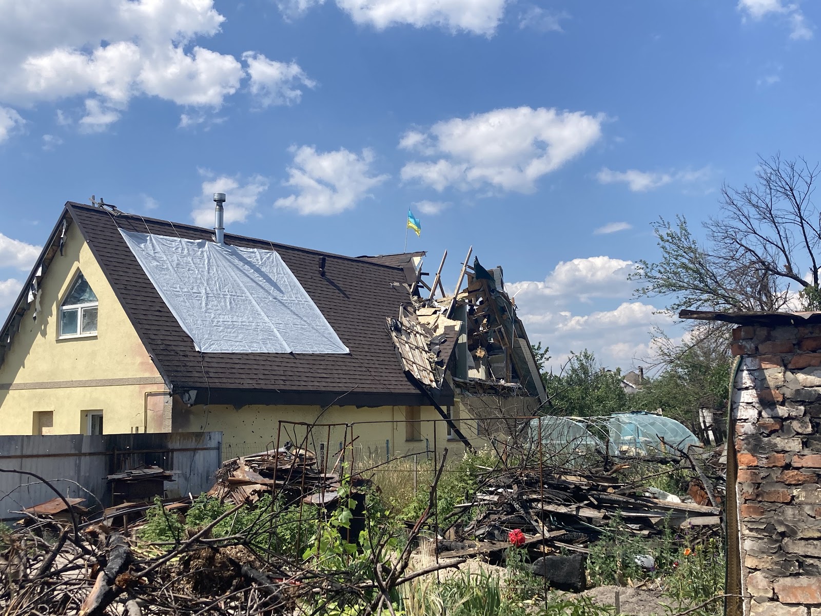 Ідемо трохи далі від центру селища і бачимо зруйновані приватні будинки. На одному з них, який зачепило частково, майоріє український синьо-жовтий прапор – прямо у місці влучання ворожого снаряда.