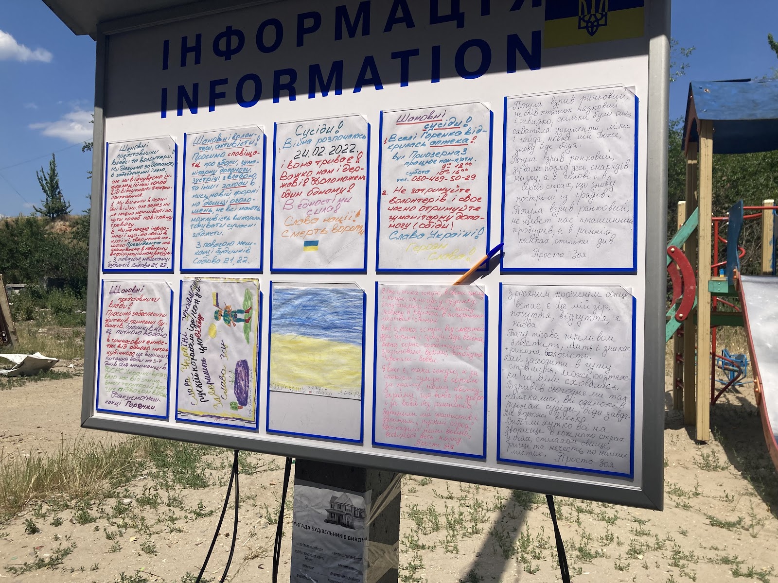 Навпроти входу в будинок висить інформаційна дошка, де є дитячі малюнки, вірші та нагадування про те, що 24-го лютого росія розпочала повномасштабне вторгнення в Україну.