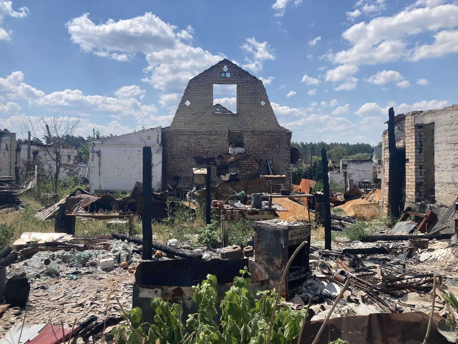 Від Києва до Мощуна всього 30 кілометрів. Вцілілих будинків після російської навали тут не лишилося. Від декотрих з них лишився лише попіл, а на згарищах можна побачити обгорілий посуд та плити.