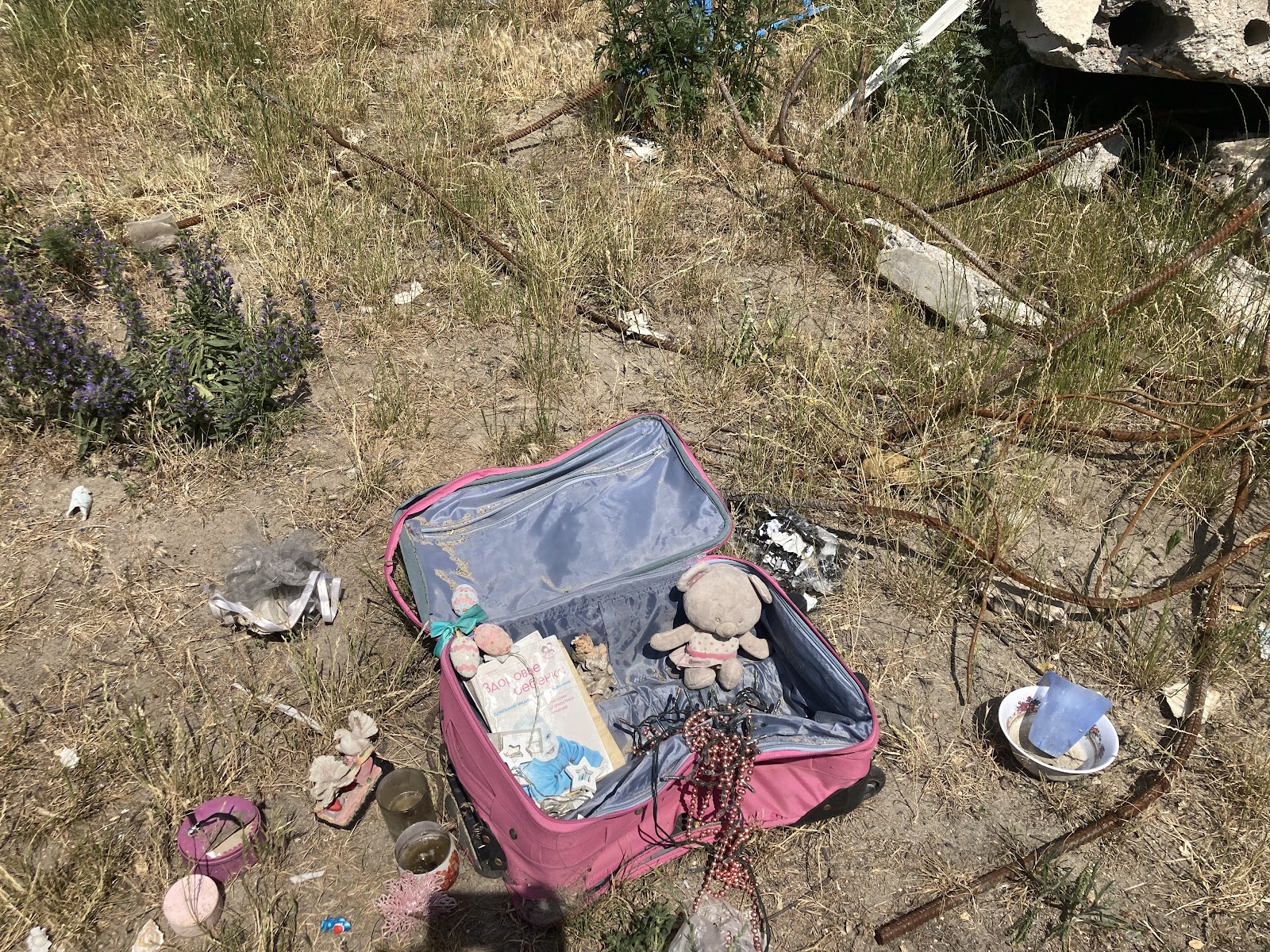 На вулиці бачимо розбитий посуд та залишки побутових предметів.