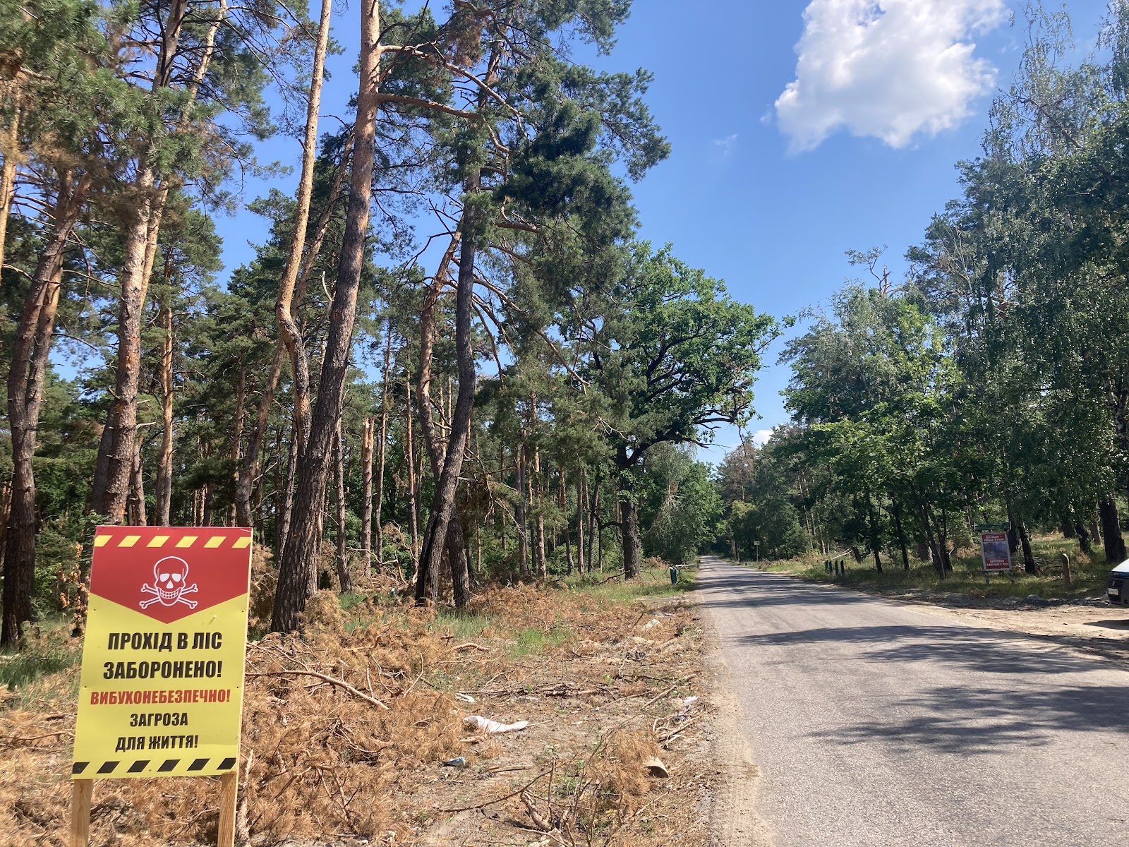 Дорога до Мощуна від Горенки пролягає крізь ліс. Обабіч дороги, яка веде до селища, – зелені дерева та хвоя, але йти до них не можна через мінну небезпеку, попередження про яку помічаємо уздовж дороги.