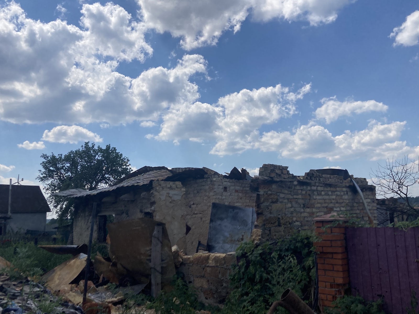 Йдучи дорогою углиб села зустрічаємо господарів, які вправно працюють у одній з пошкоджених домівок.