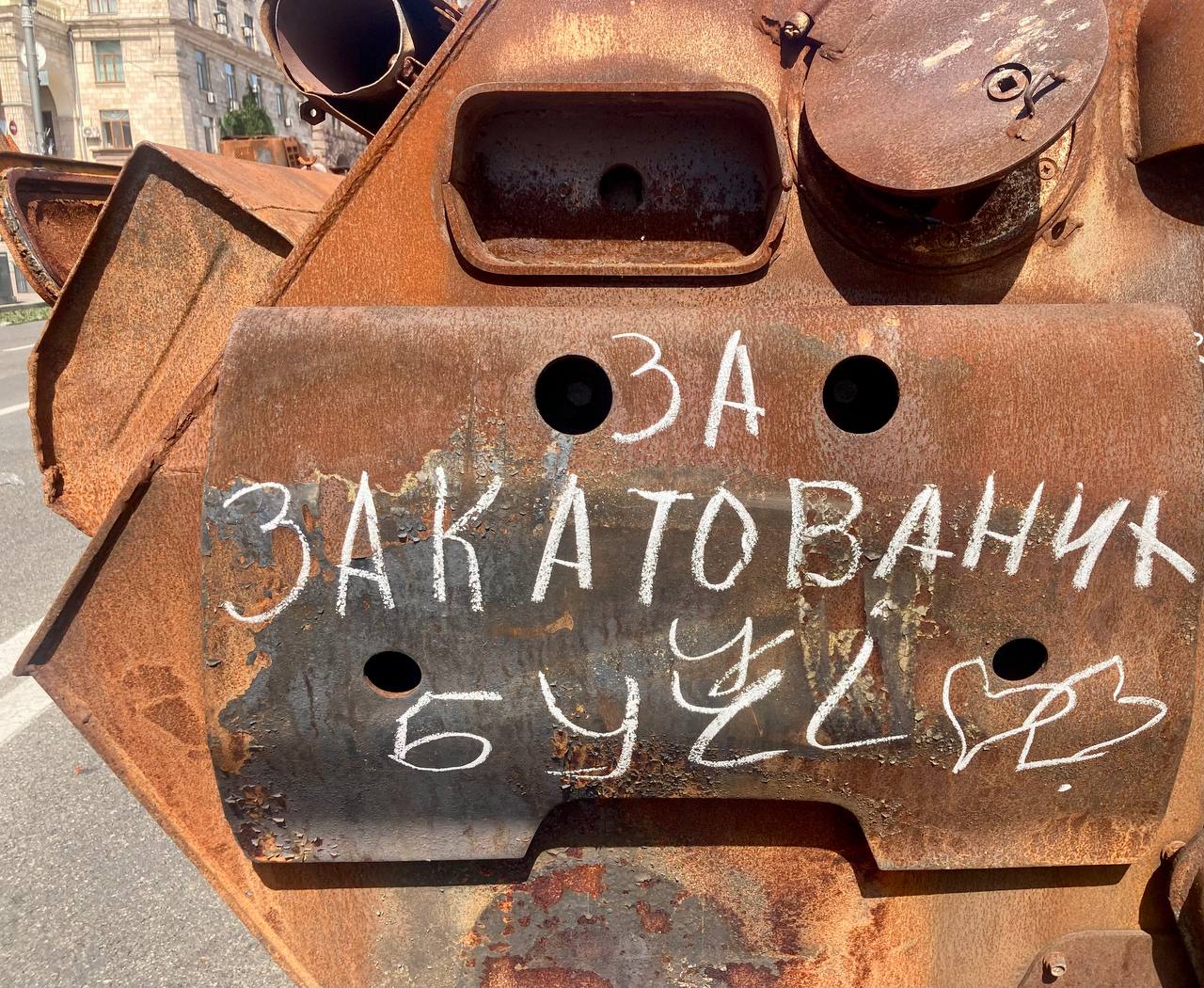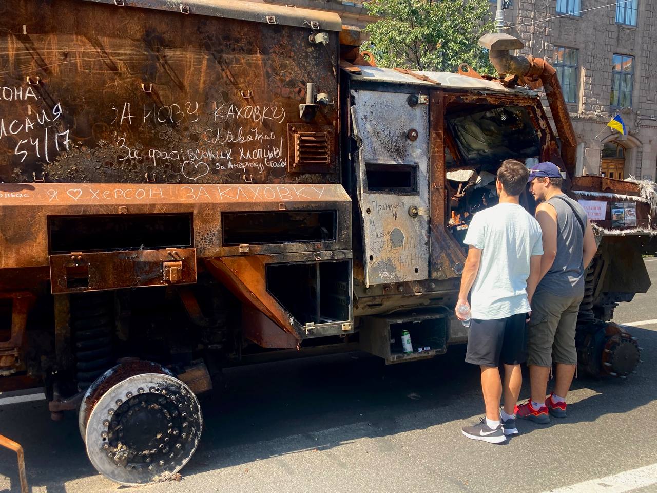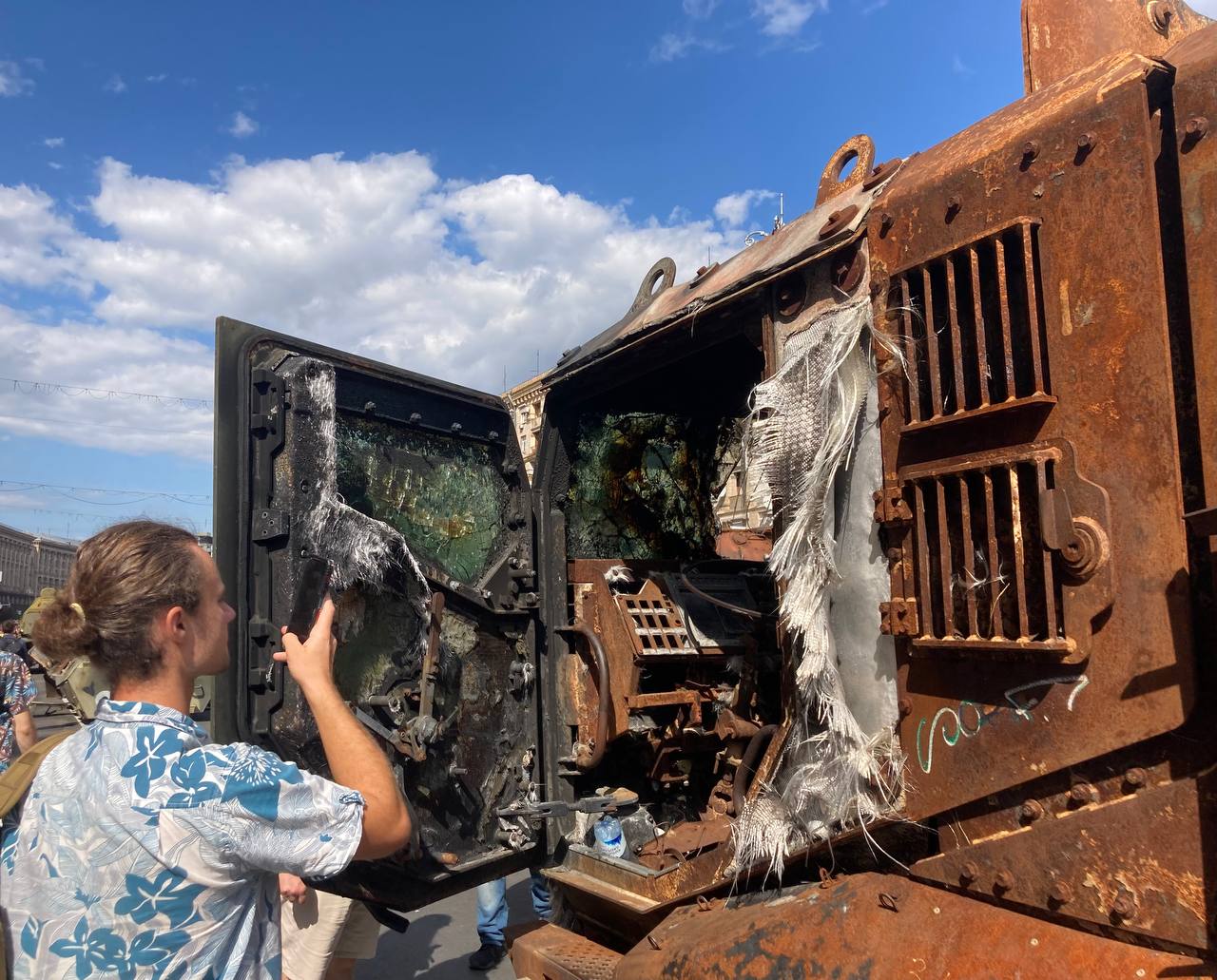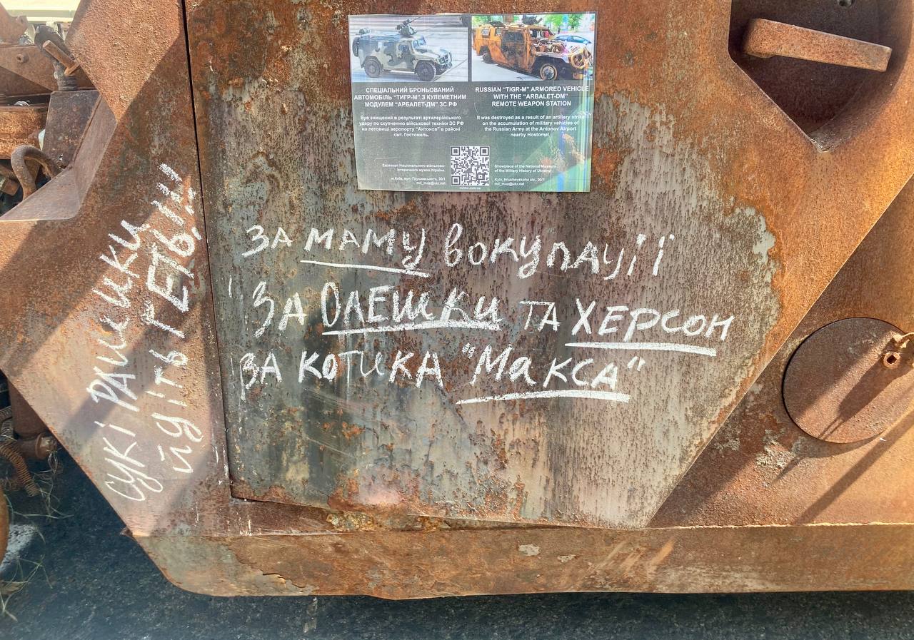 Сім’ї з дітьми та домашніми улюбленцями вже другий рік поспіль виходять у ці святкові дні подивитись на залишки російських броньовиків та залишити на них написи.